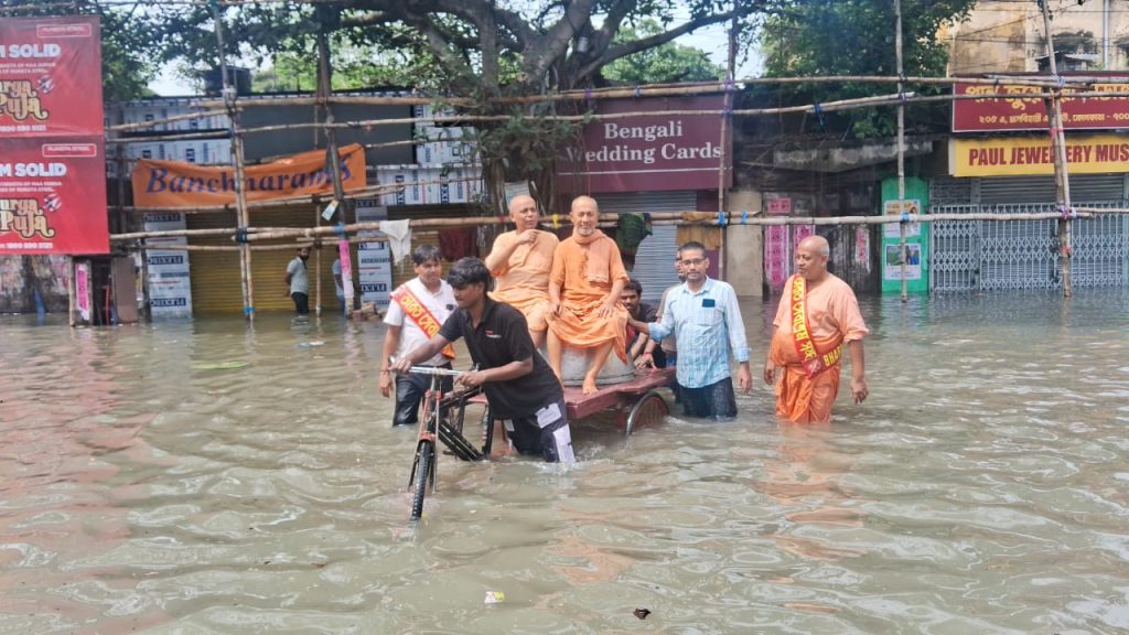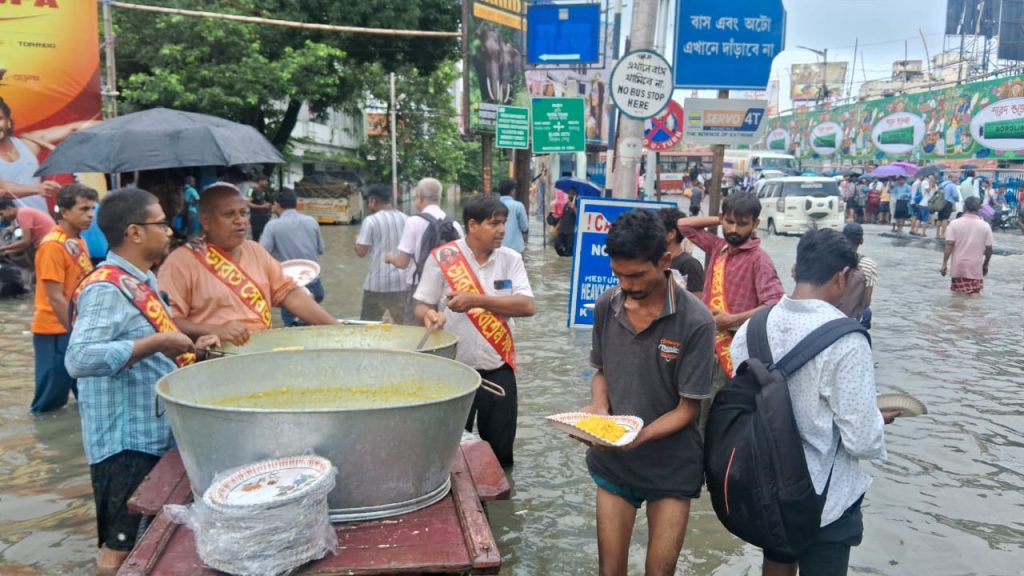 টানা বর্ষণ এবং ভরা কোটালের জেরে গঙ্গার জলস্তর বেড়ে যাওয়ায় গোটা কলকাতা শহর কার্যত জলমগ্ন। বালিগঞ্জের ভারত সেবাশ্রম সংঘের প্রধান কার্যালয়ও সেই জলের কবলে । রান্নাঘর থেকে আশ্রম প্রাঙ্গণ সর্বত্র জল থইথই। তবুও থেমে থাকেনি মানবসেবার কাজ। জমা জলের মধ্যেই বড় বড় হাঁড়িতে খিচুড়ি